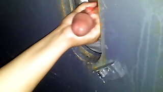 Naughty amateur brown-haired is sucking a stranger's dick thru a gloryhole, just for the fun of it