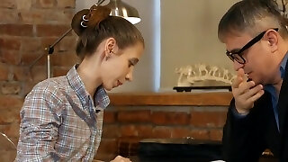 Skinny teen gargles the trunk of an old man she swallows cum