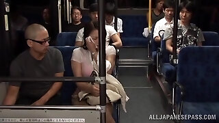 deux mecs baisent les seins gigantesques d'une nymphe asiatique aux gros seins dans le bus public