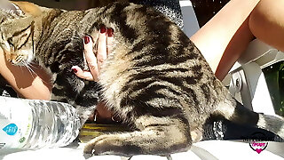 एक मोटी ककड़ी के साथ उसकी बिल्ली कमबख्त, जब तक वह स्वादिष्ट रूप से स्खलन नहीं करती, वह एक फूहड़ है